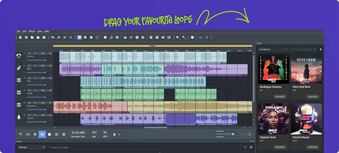 Discover the easiest way to create music in a DAW. Pick sounds from any genre, drag and drop them into your track, and let MUSIC MAKER mix it all for you.